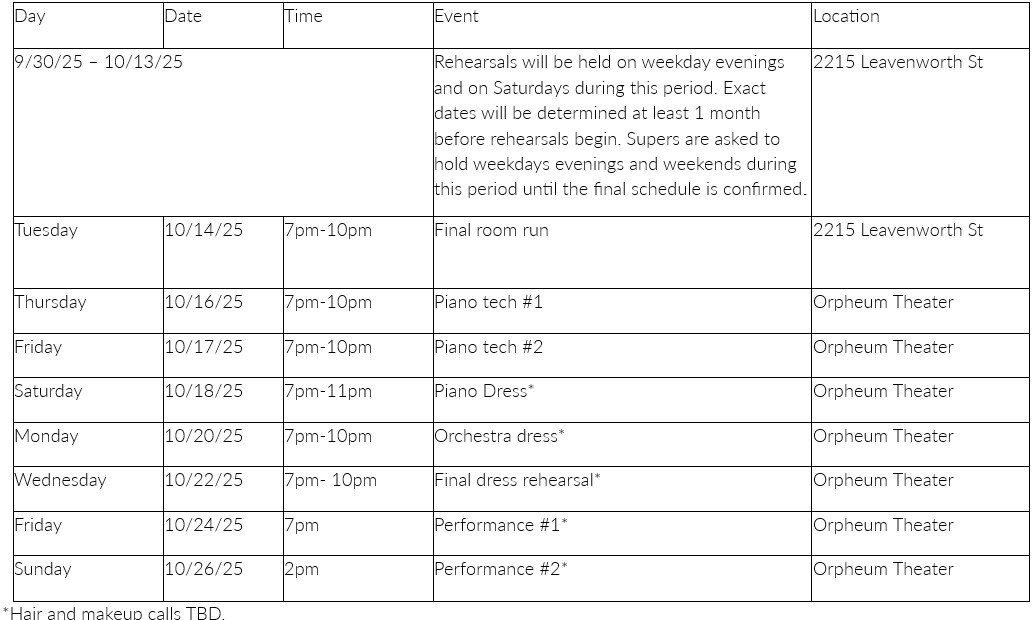 Each supernumerary/Flamenco dancer will receive a fee of $500, which is inclusive of rehearsals, costume fittings, and performances.
