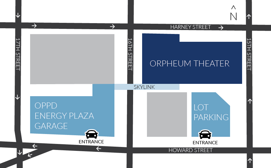 Multiple surface and garage parking options are offered all within two blocks of the Orpheum Theater and additional parking is available at the OPPD Energy Plaza on Howard Street between 16th and 17th Streets. For patrons parking at OPPD, exit the OPPD Energy Plaza garage through the Orpheum Skylink and walk directly into the Orpheum Theater third floor lobby.