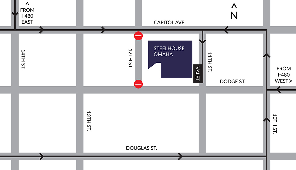 Complimentary valet parking is provided for all guests at the corner of 11th Street and Dodge Street. We suggest arriving from the intersection of Capitol Avenue and 11th Street.