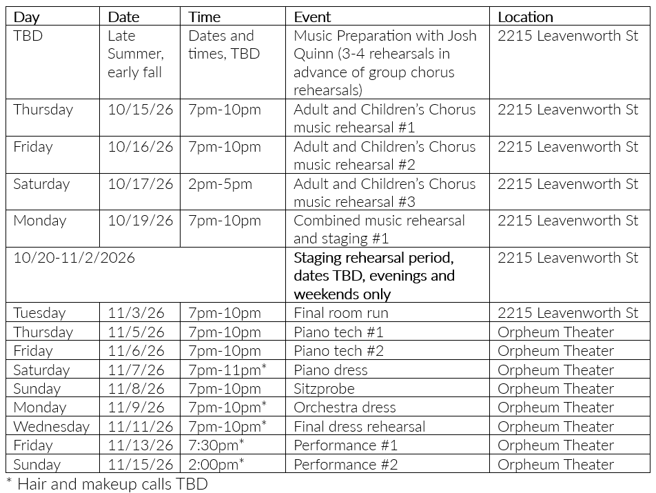 Music preparation rehearsals with Head of Music, Josh Quinn, in the 1-2 months before full chorus rehearsals with the adult chorus begin on Oct 15. Music preparation dates are TBD.