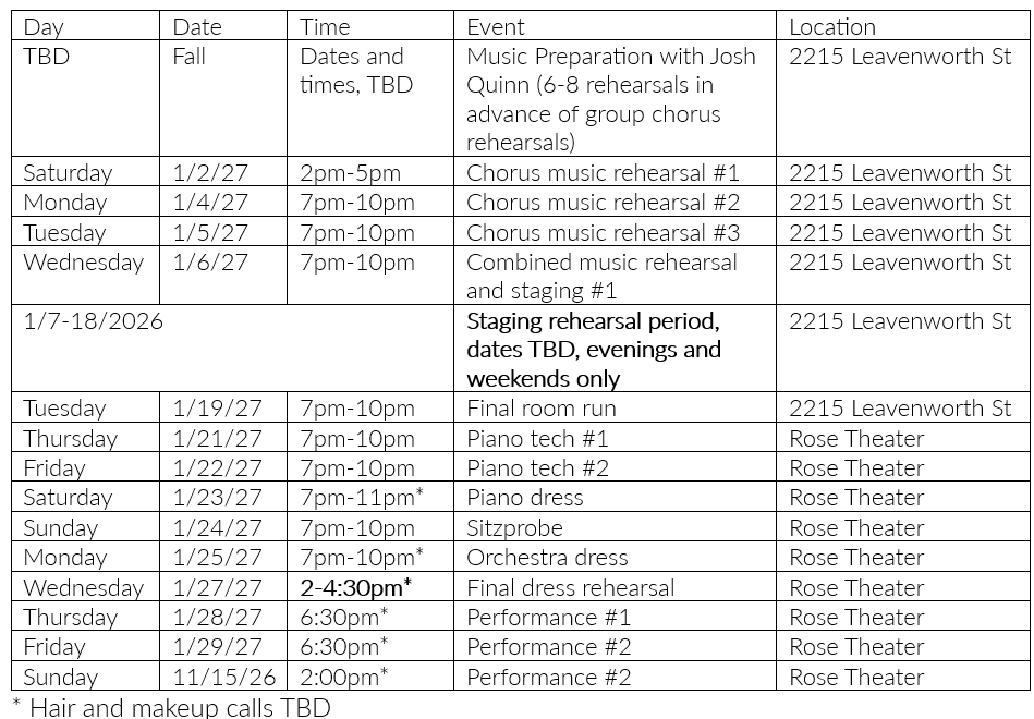 Parents will be contacted to confirm the staging rehearsal dates one month before chorus rehearsals begin on January 2. We anticipate 6-8 staging rehearsals (3-hour calls each) prior to the Final Room Run. These will be scheduled in the evenings and weekends to accommodate families.