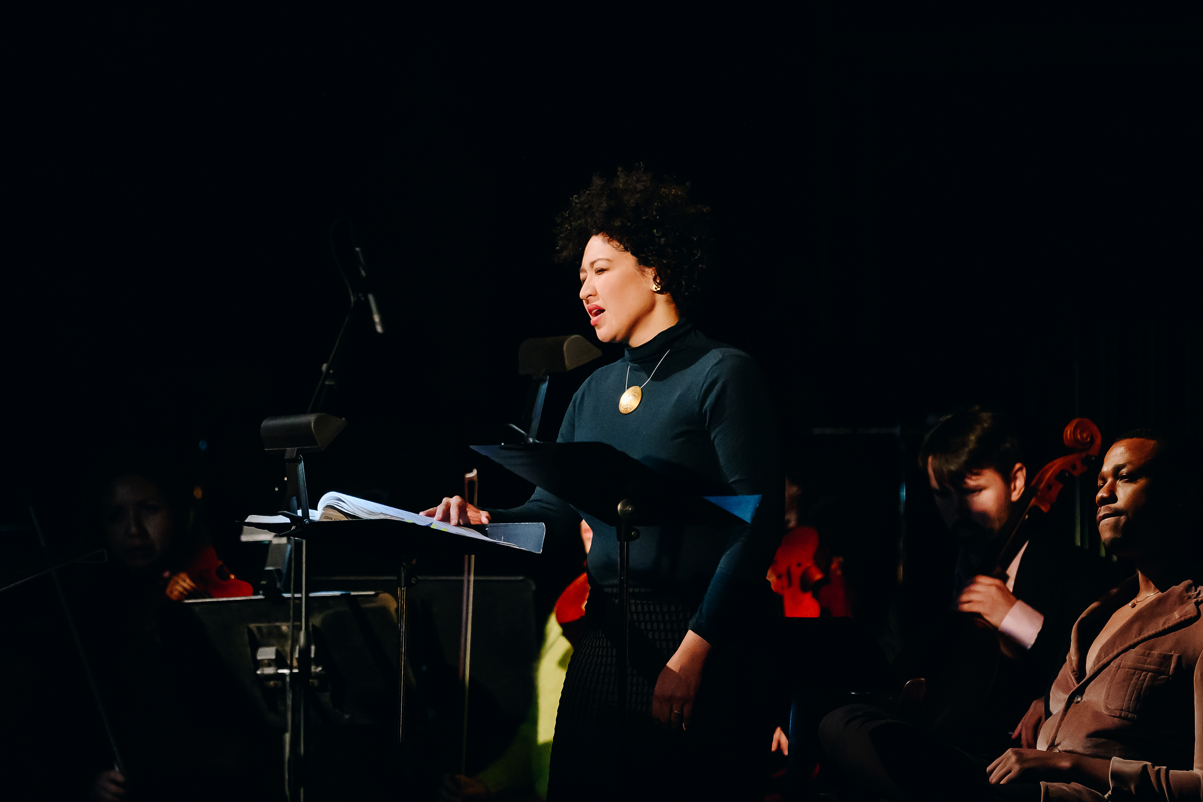 The cast of this Christmas oratorio, an AMOC* production, features company members soprano Julia Bullock, countertenor Kyle Tingzon, bass-baritone Davóne Tines, violinists Miranda Cuckson and Keir GoGwilt, cellist Coleman Itzkoff, bassist Doug Balliett, percussionist Jonny Allen, pianist Conor Hanick, with special guests, including Jasmin White, contralto.